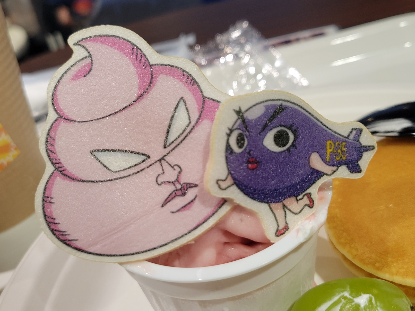 ビュティとへっくんのいちごミルク~~!!かわいい~~~!!!!惜しみ無く盛られたクリームが食後の胃袋を襲うッ!!!